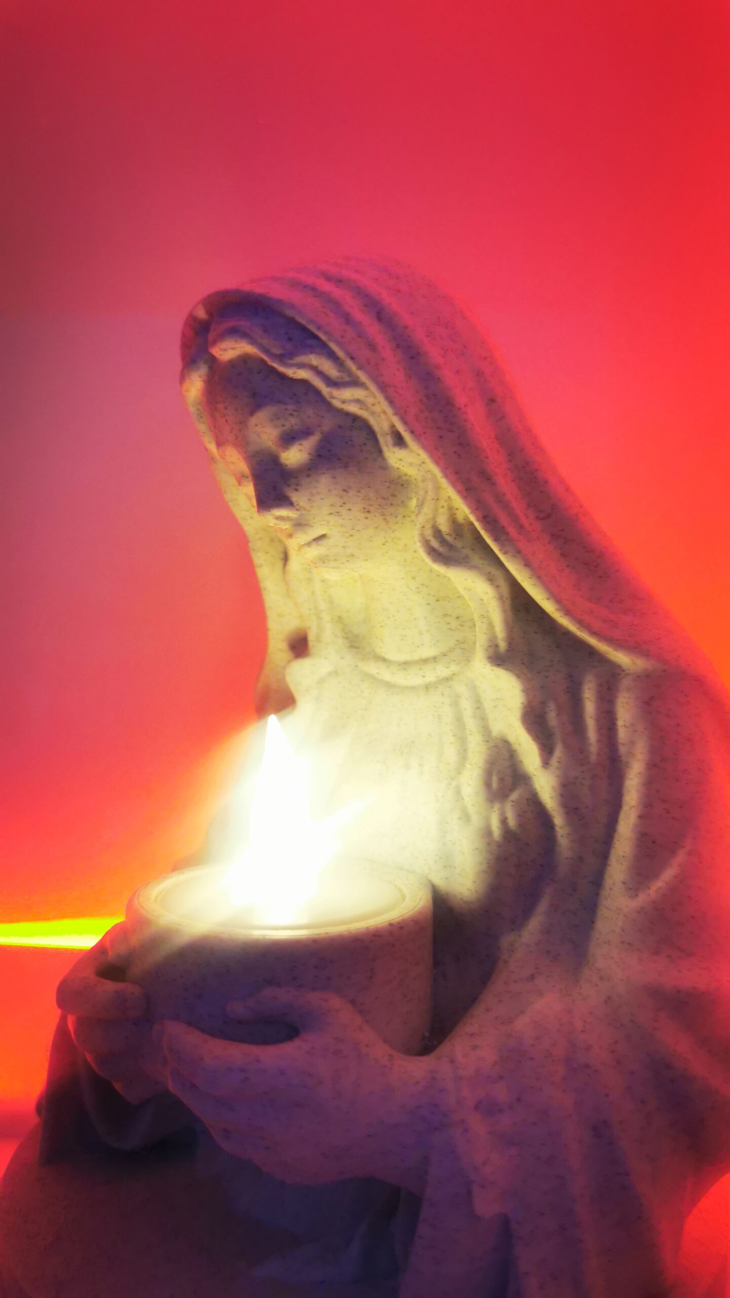 Il volto raccolto, gli occhi chiusi e l’espressione serena trasmettono calma, introspezione e protezione. Le mani custodiscono una luce viva, simbolo di speranza e presenza, che illumina delicatamente il volto e crea un’atmosfera intima e profonda.